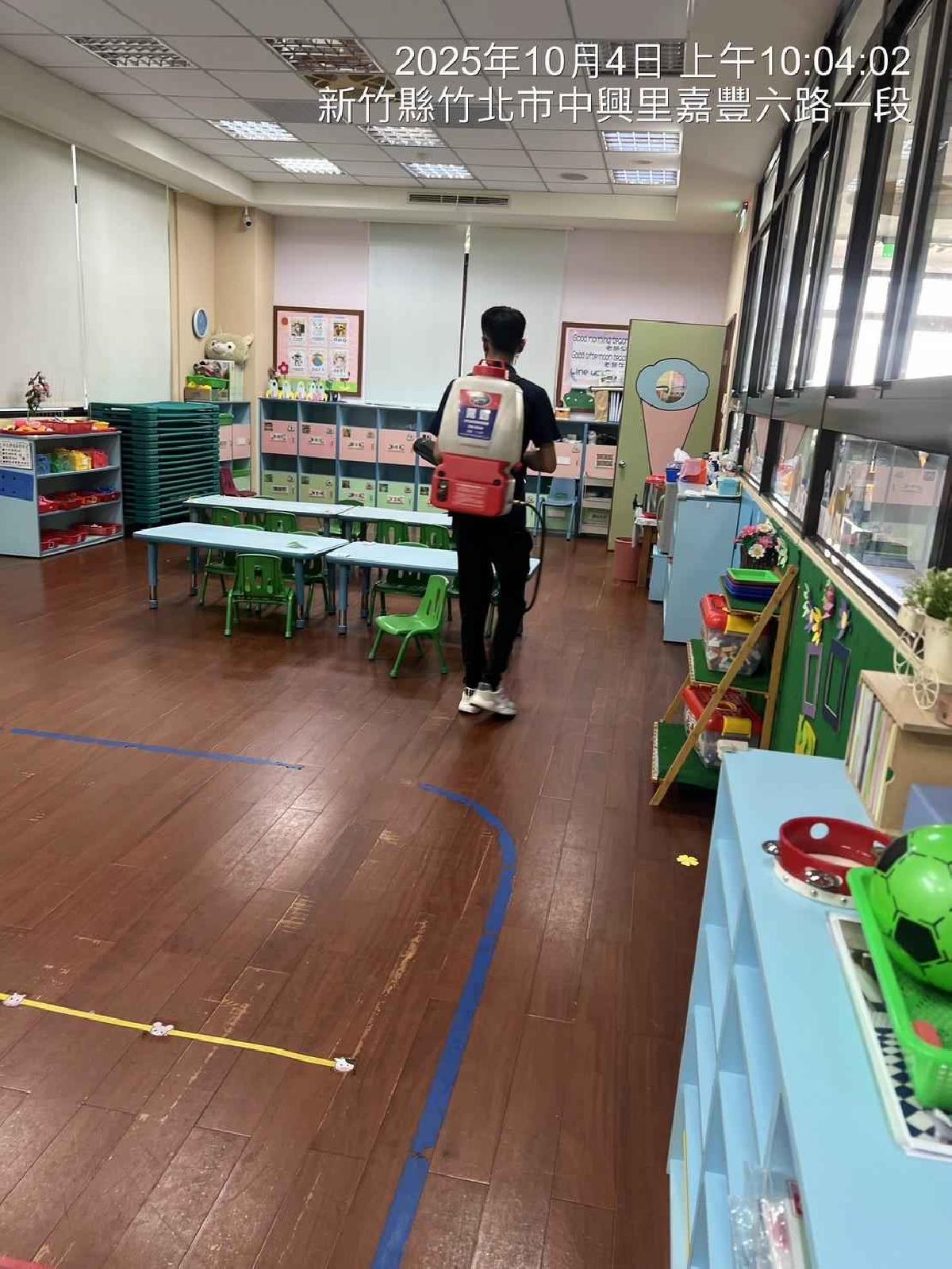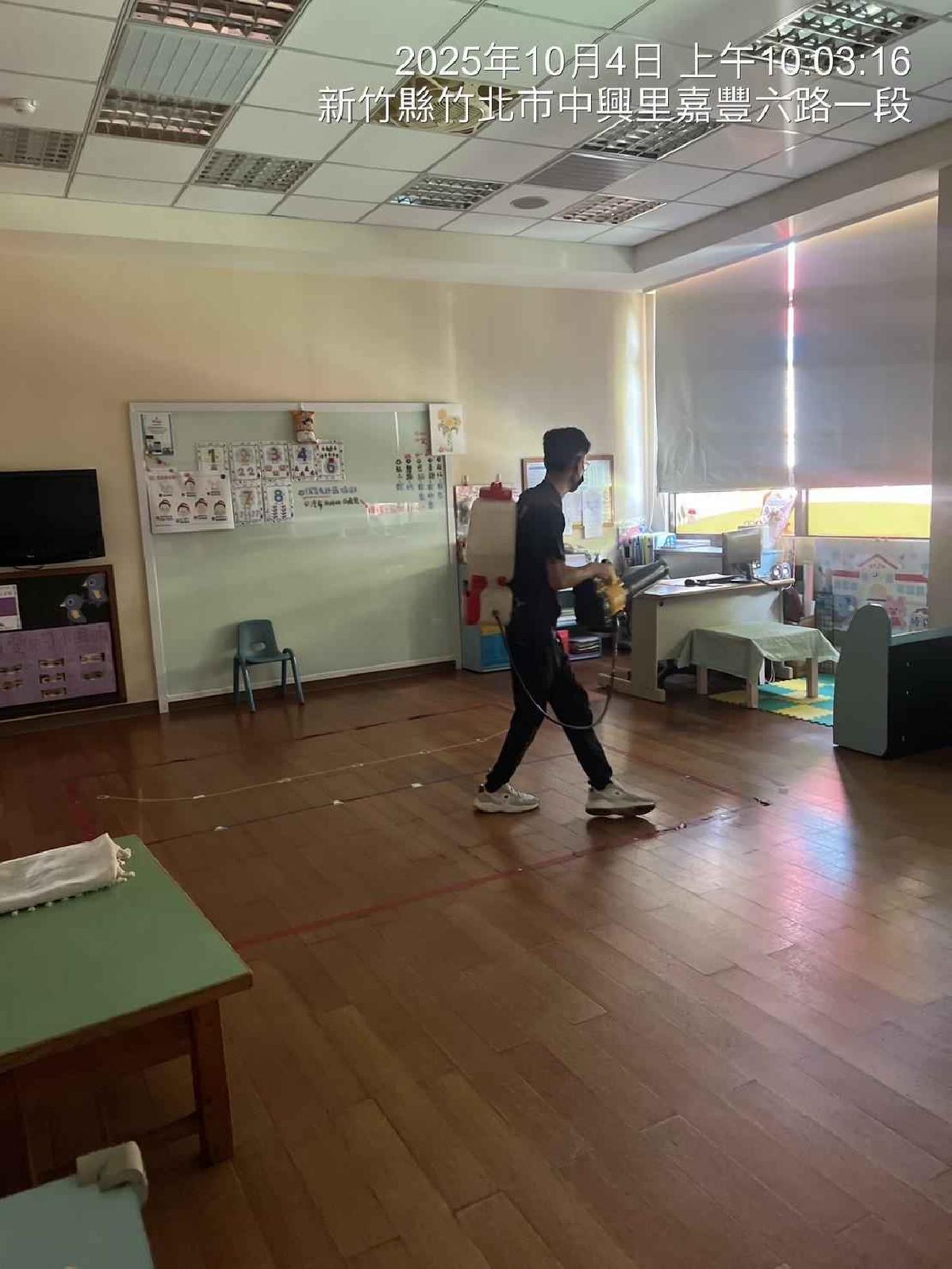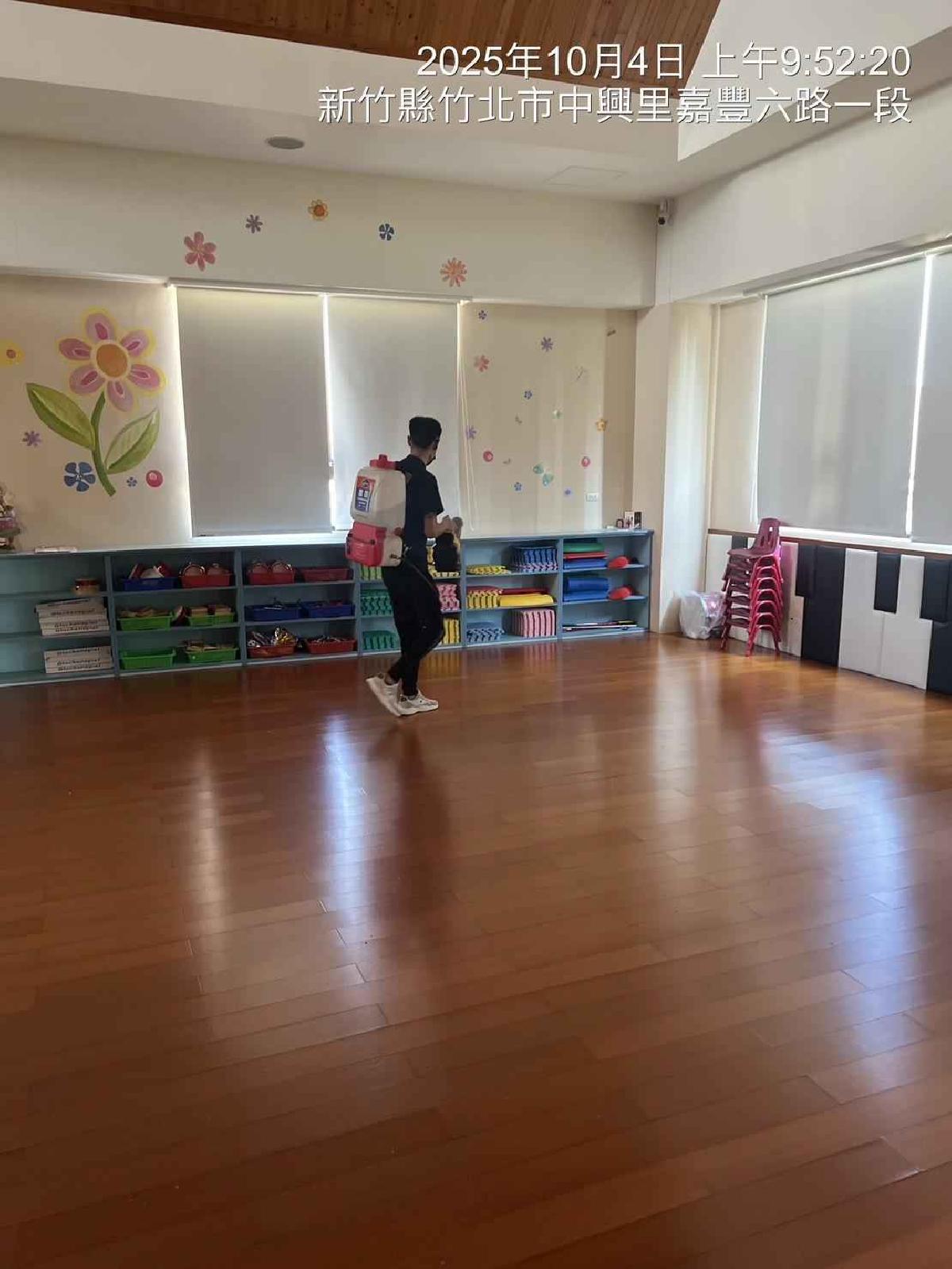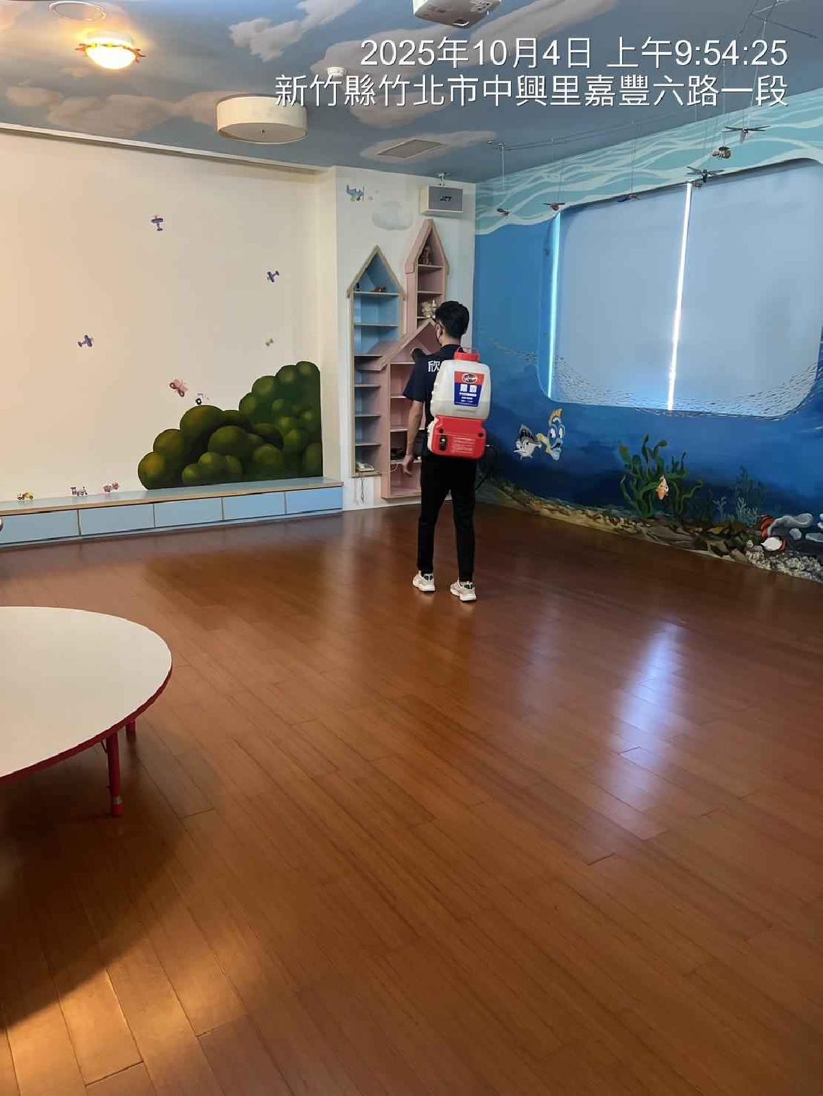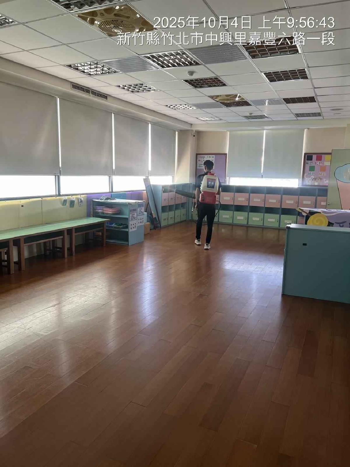 本園利用假日時間,特別聘請專業廠商進行全園環境消毒作業,包含教室、走廊、廁所及遊戲區,確保幼兒返園後有一個安全、乾淨的學習環境。
