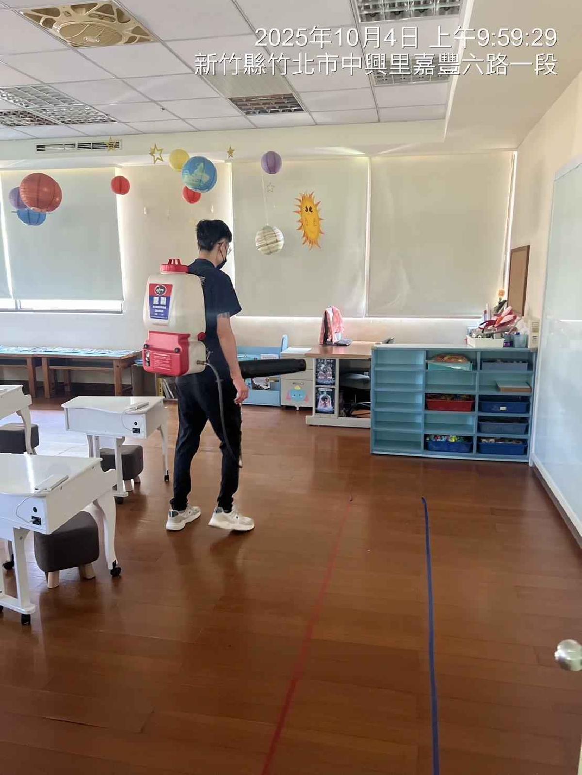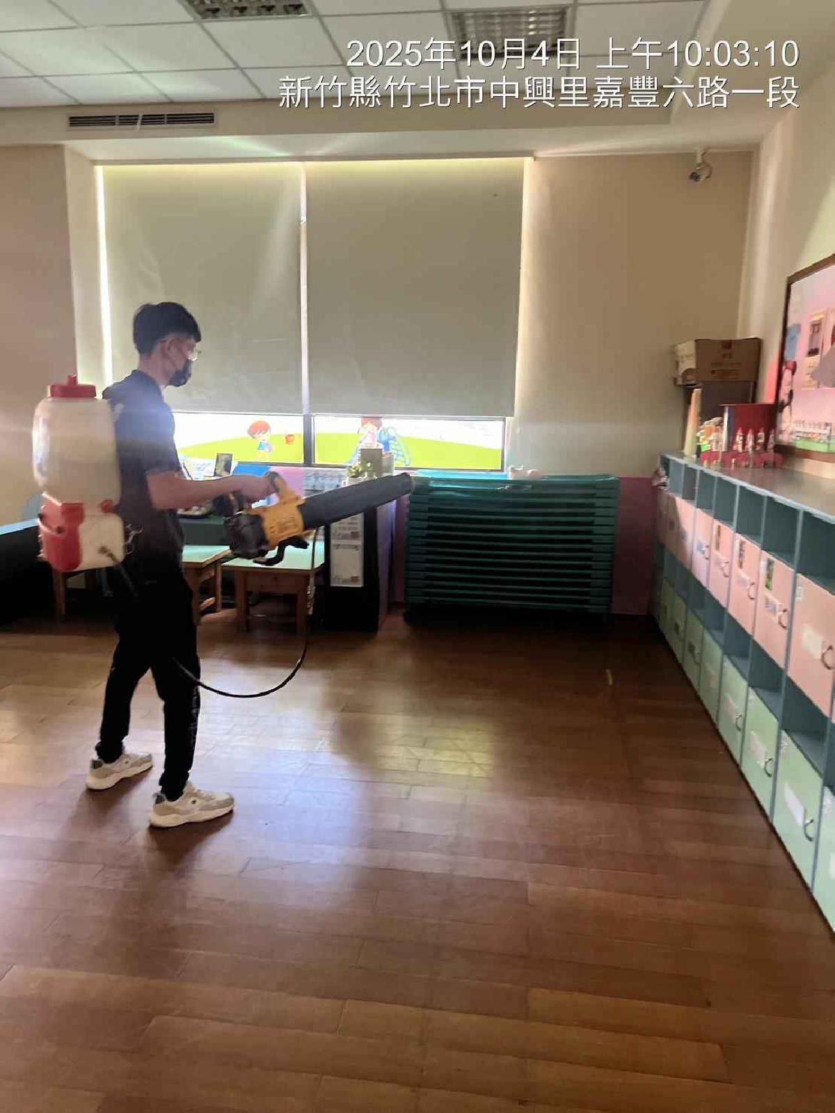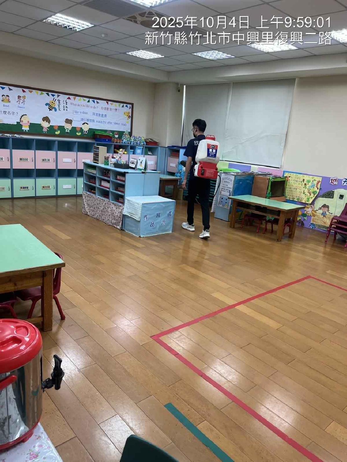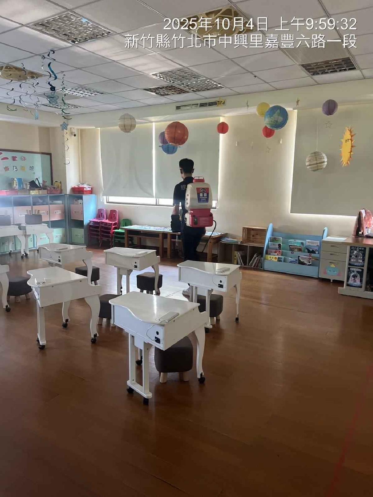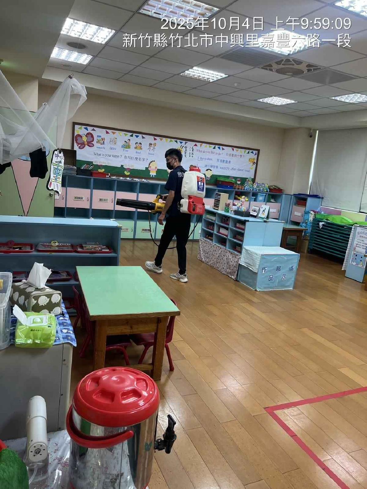 本園利用假日時間,特別聘請專業廠商進行全園環境消毒作業,包含教室、走廊、廁所及遊戲區,確保幼兒返園後有一個安全、乾淨的學習環境。