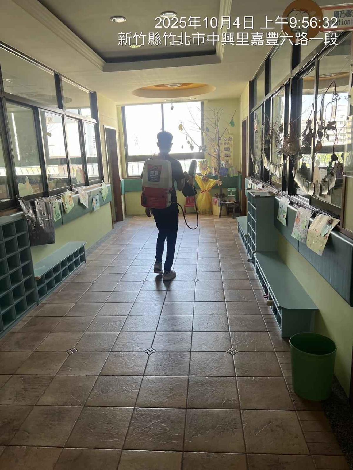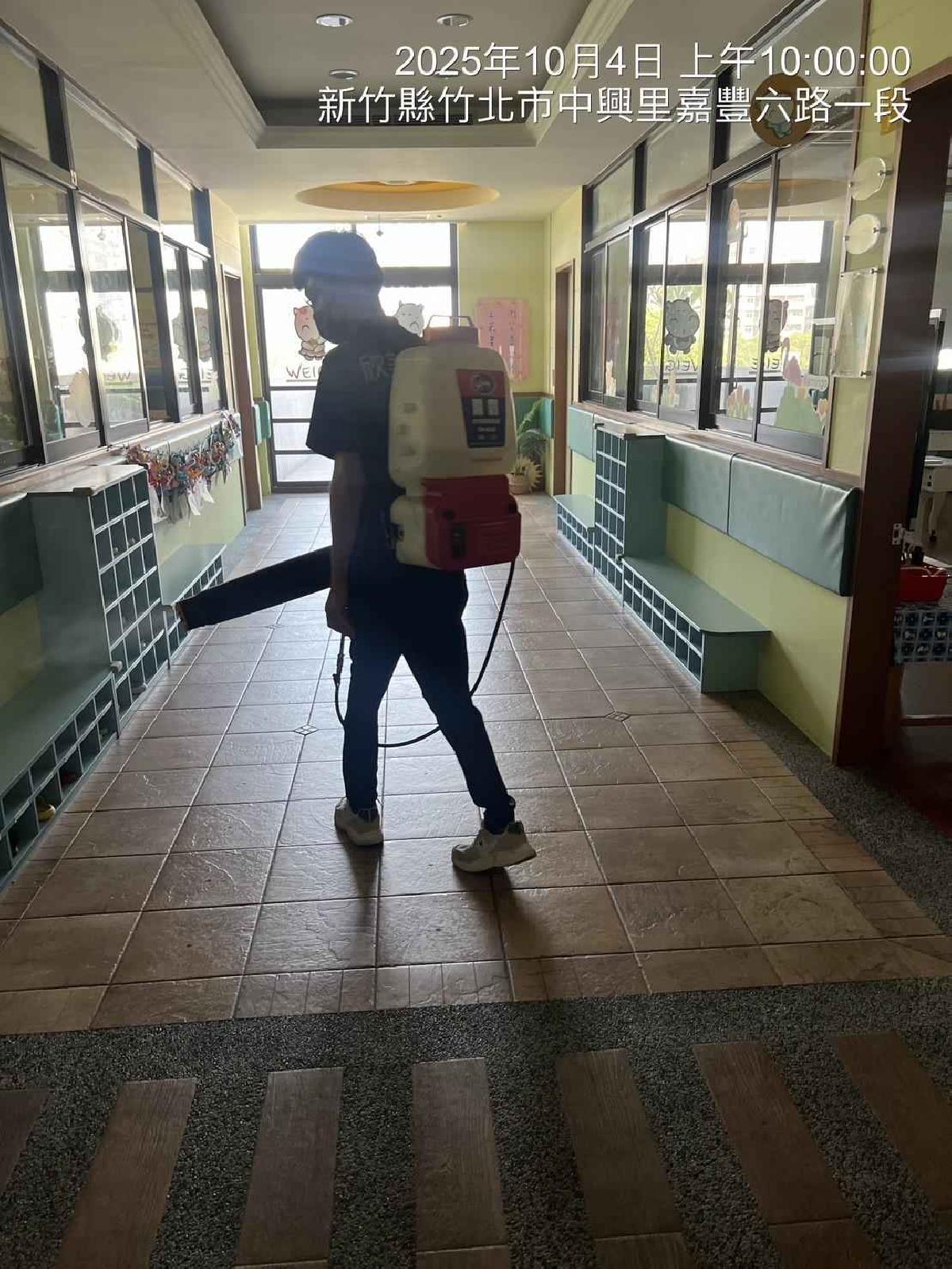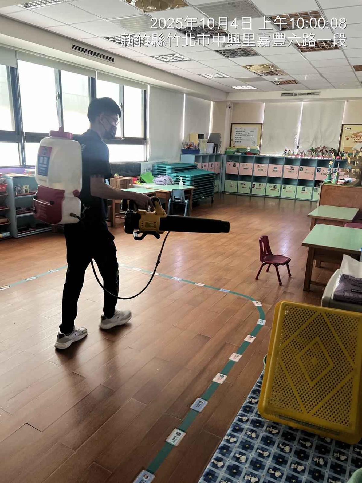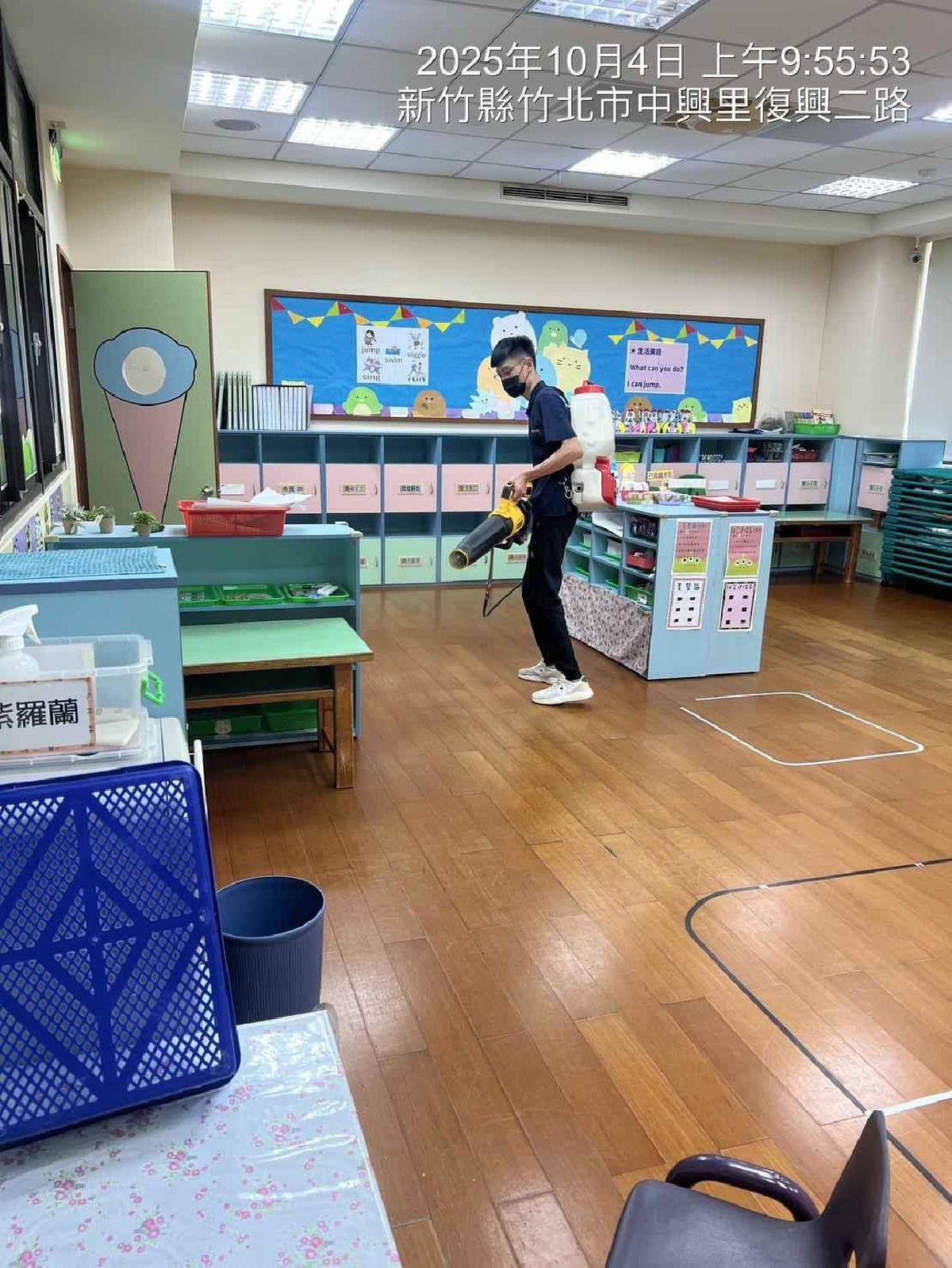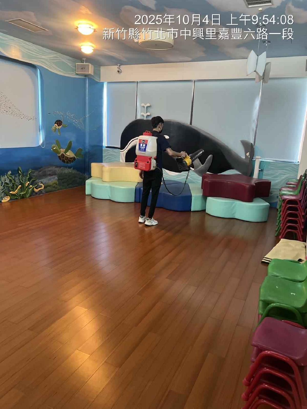 本園利用假日時間,特別聘請專業廠商進行全園環境消毒作業,包含教室、走廊、廁所及遊戲區,確保幼兒返園後有一個安全、乾淨的學習環境。