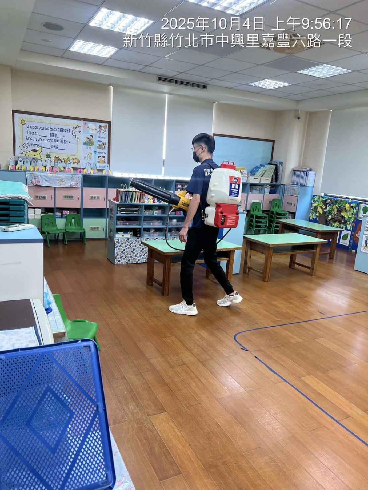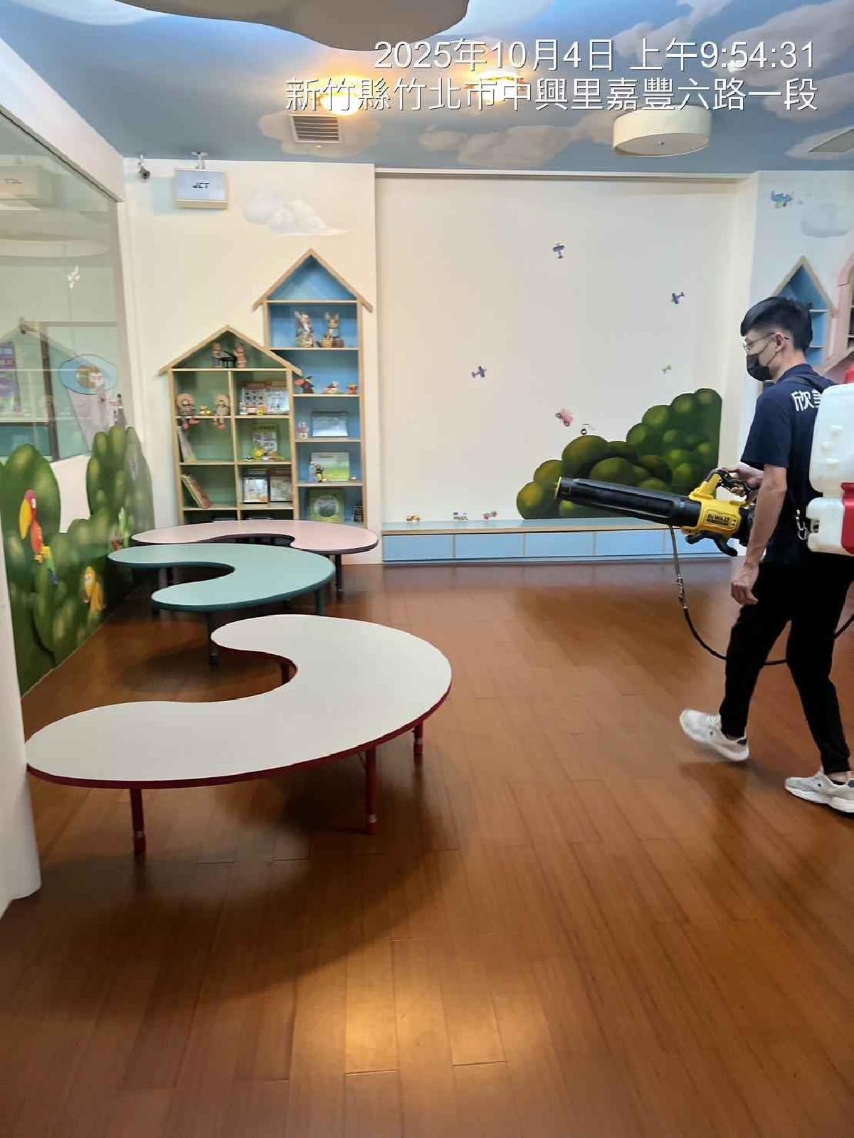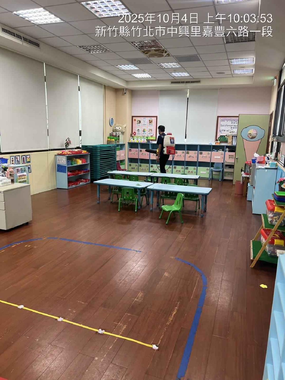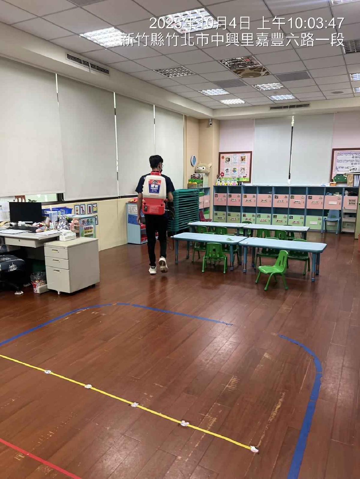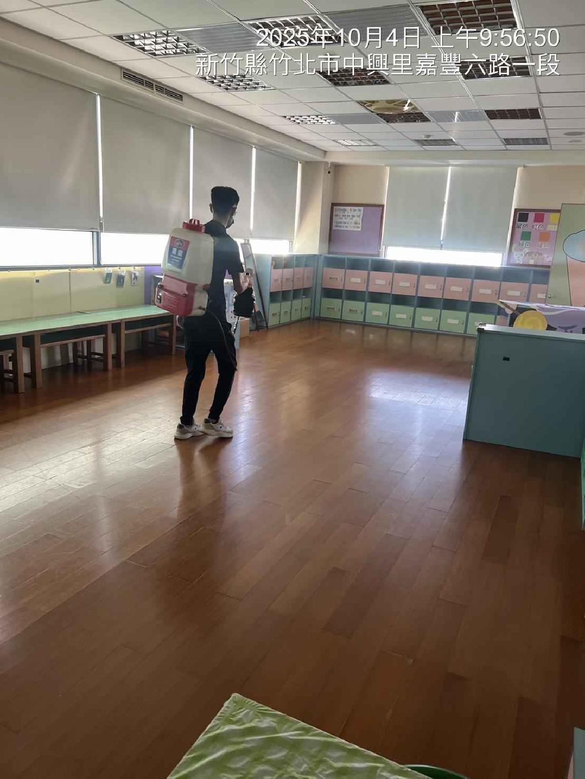 本園利用假日時間,特別聘請專業廠商進行全園環境消毒作業,包含教室、走廊、廁所及遊戲區,確保幼兒返園後有一個安全、乾淨的學習環境。