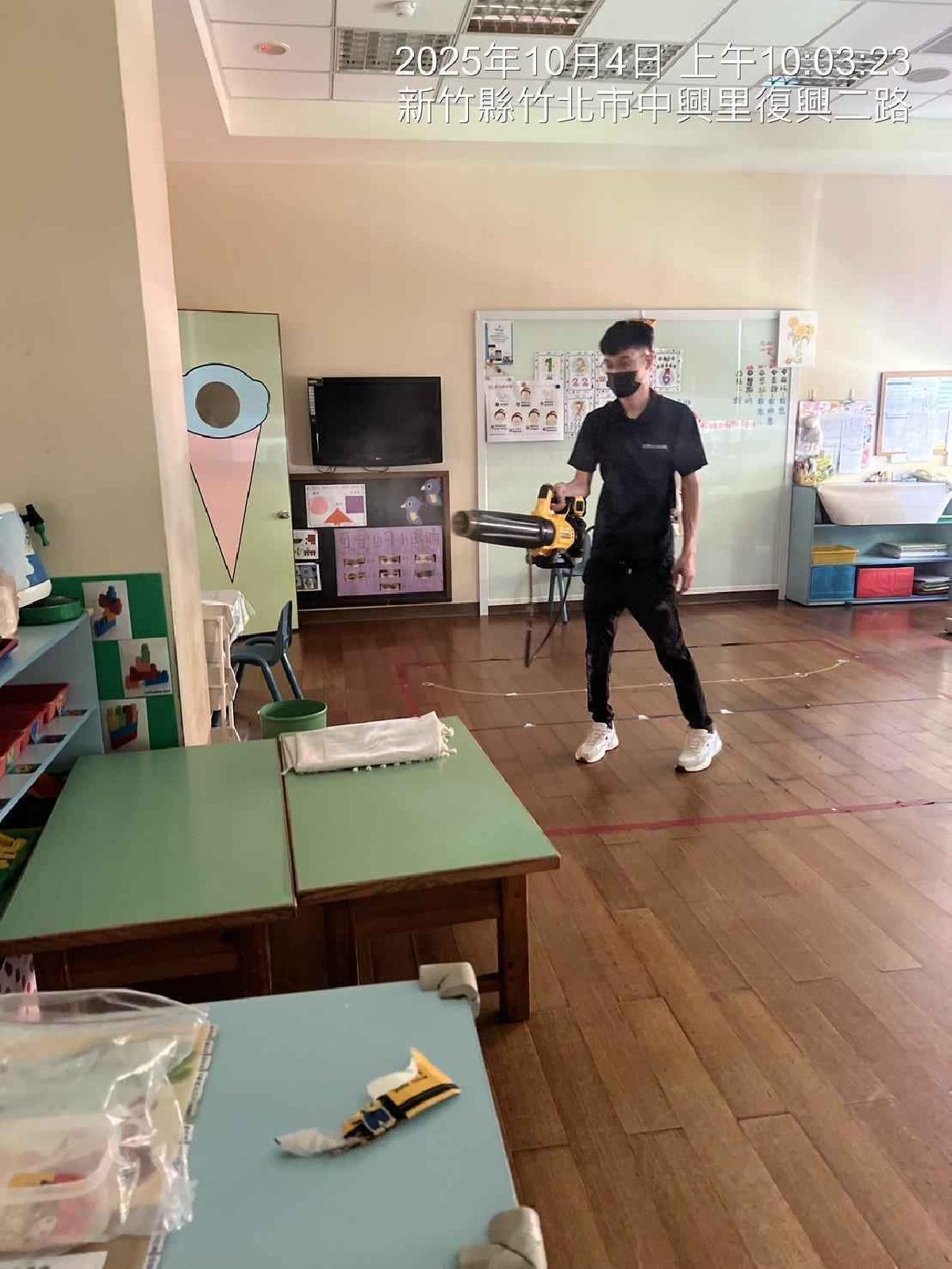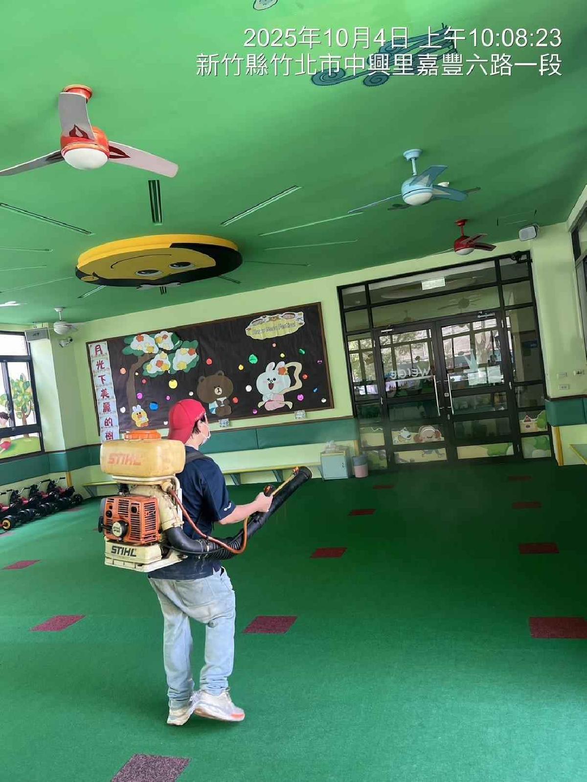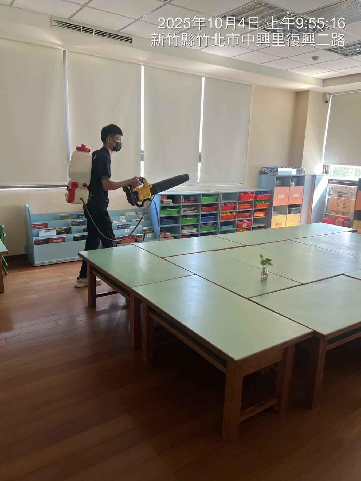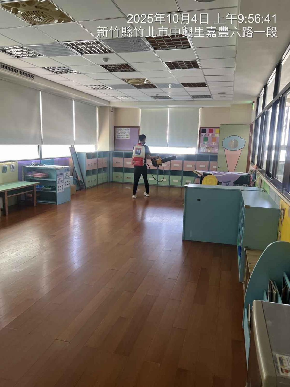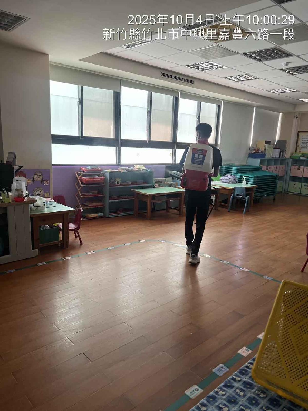 本園利用假日時間,特別聘請專業廠商進行全園環境消毒作業,包含教室、走廊、廁所及遊戲區,確保幼兒返園後有一個安全、乾淨的學習環境。