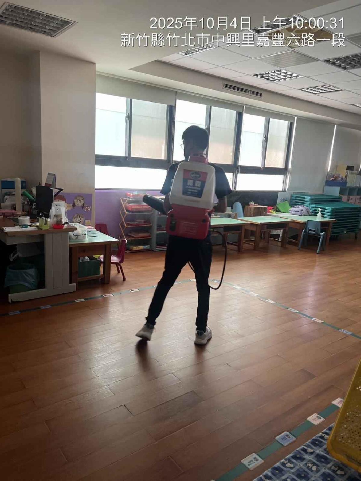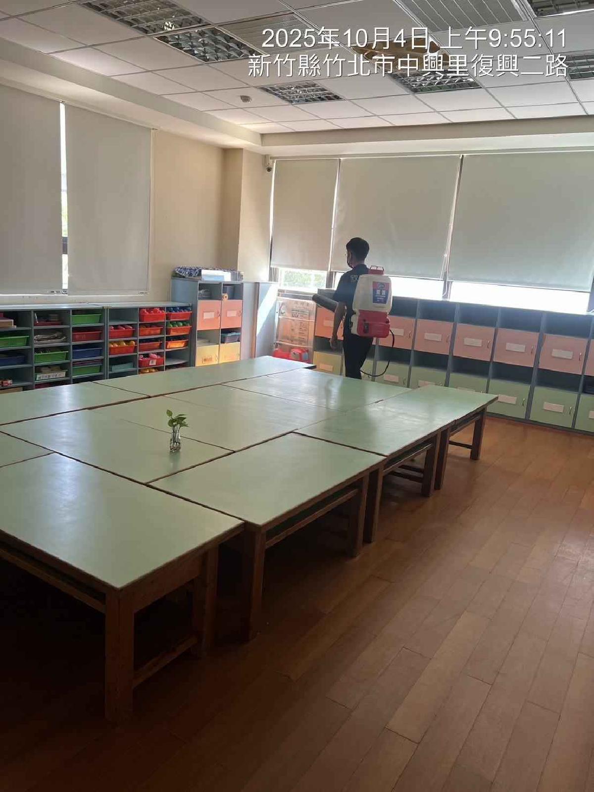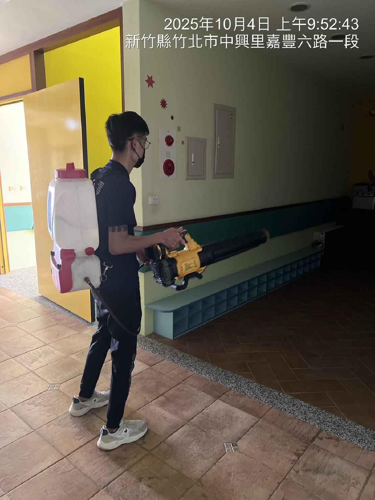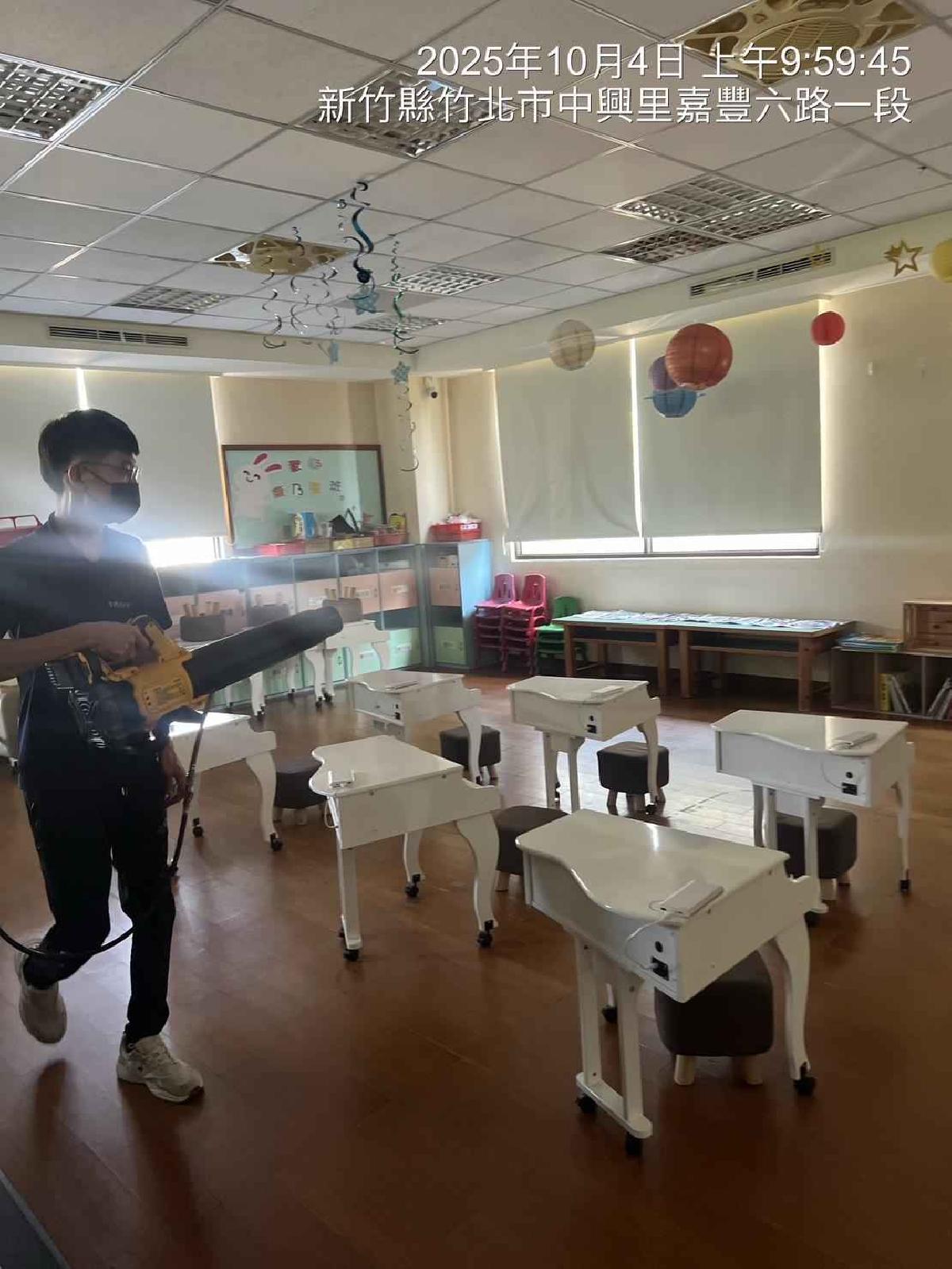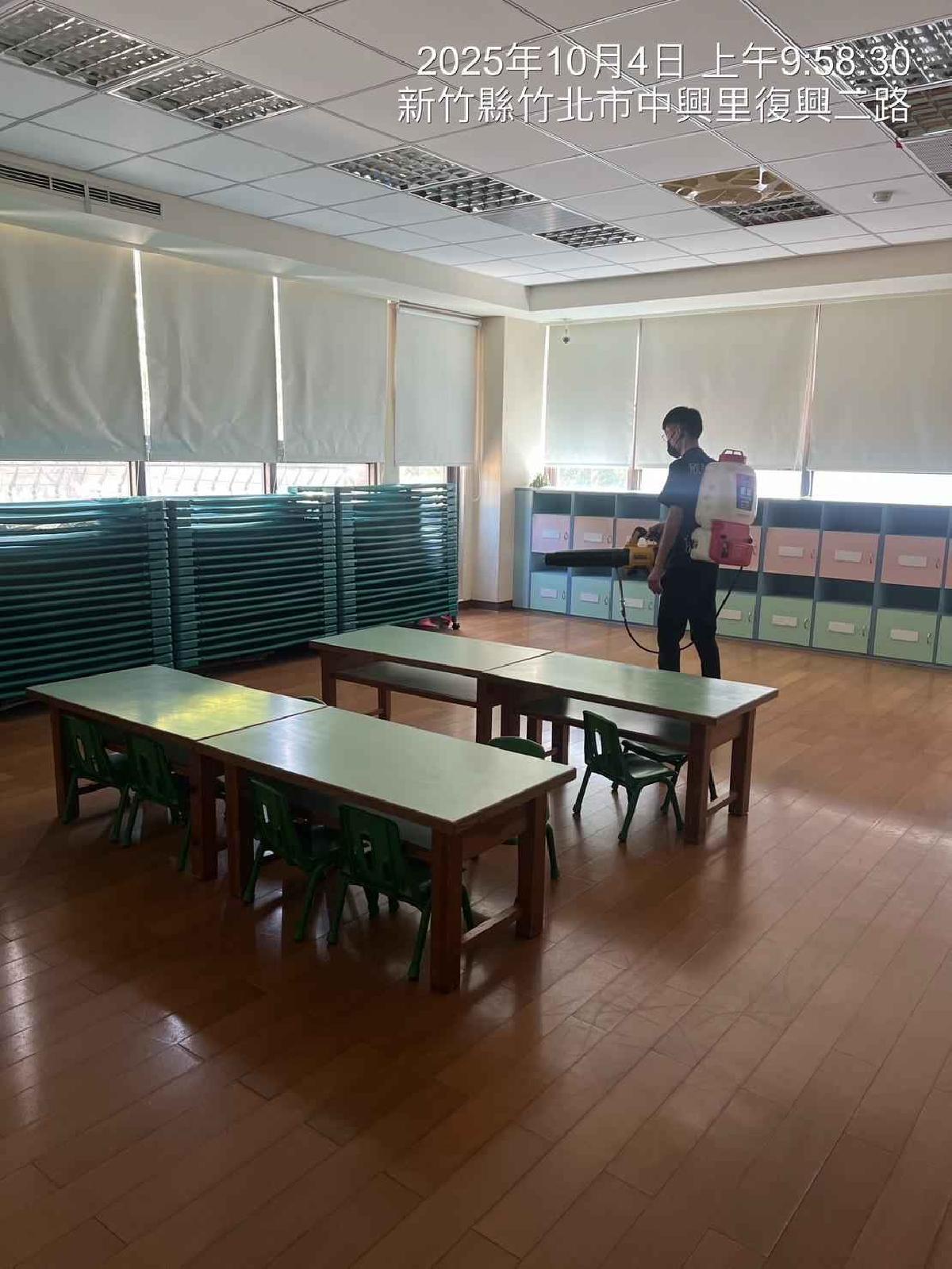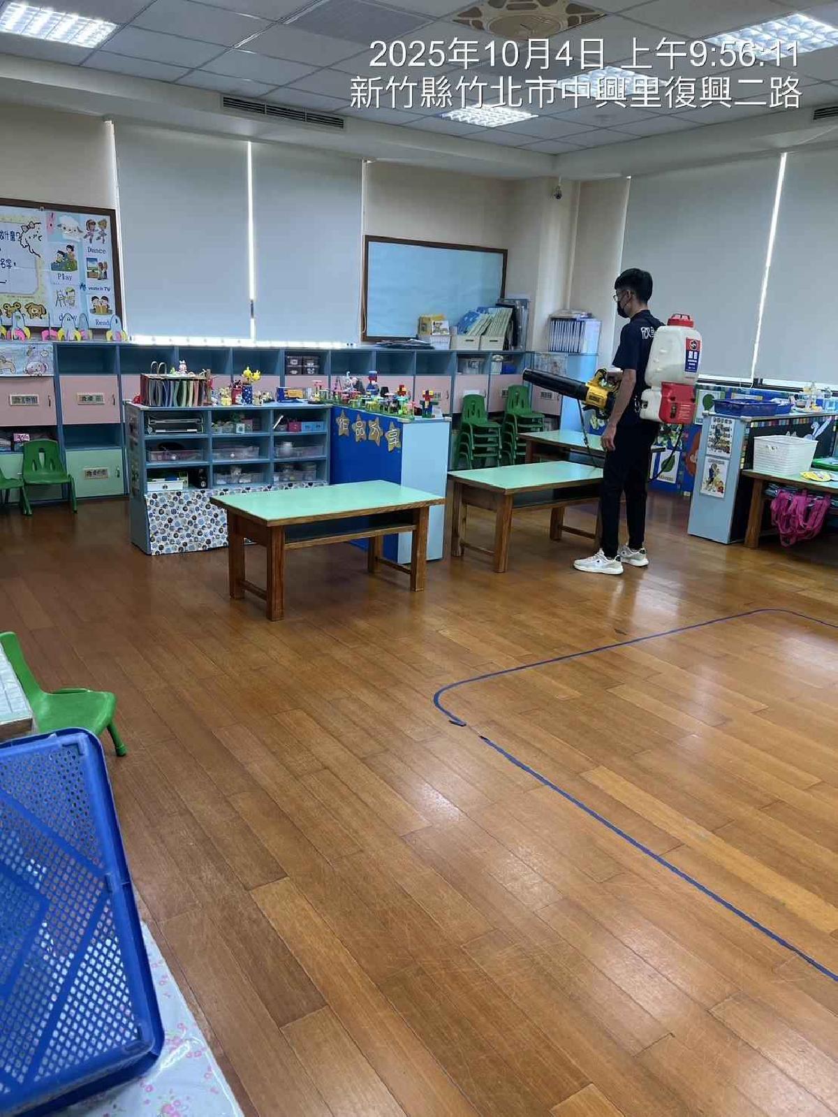 本園利用假日時間,特別聘請專業廠商進行全園環境消毒作業,包含教室、走廊、廁所及遊戲區,確保幼兒返園後有一個安全、乾淨的學習環境。