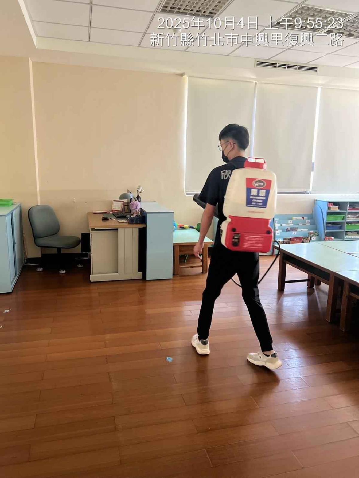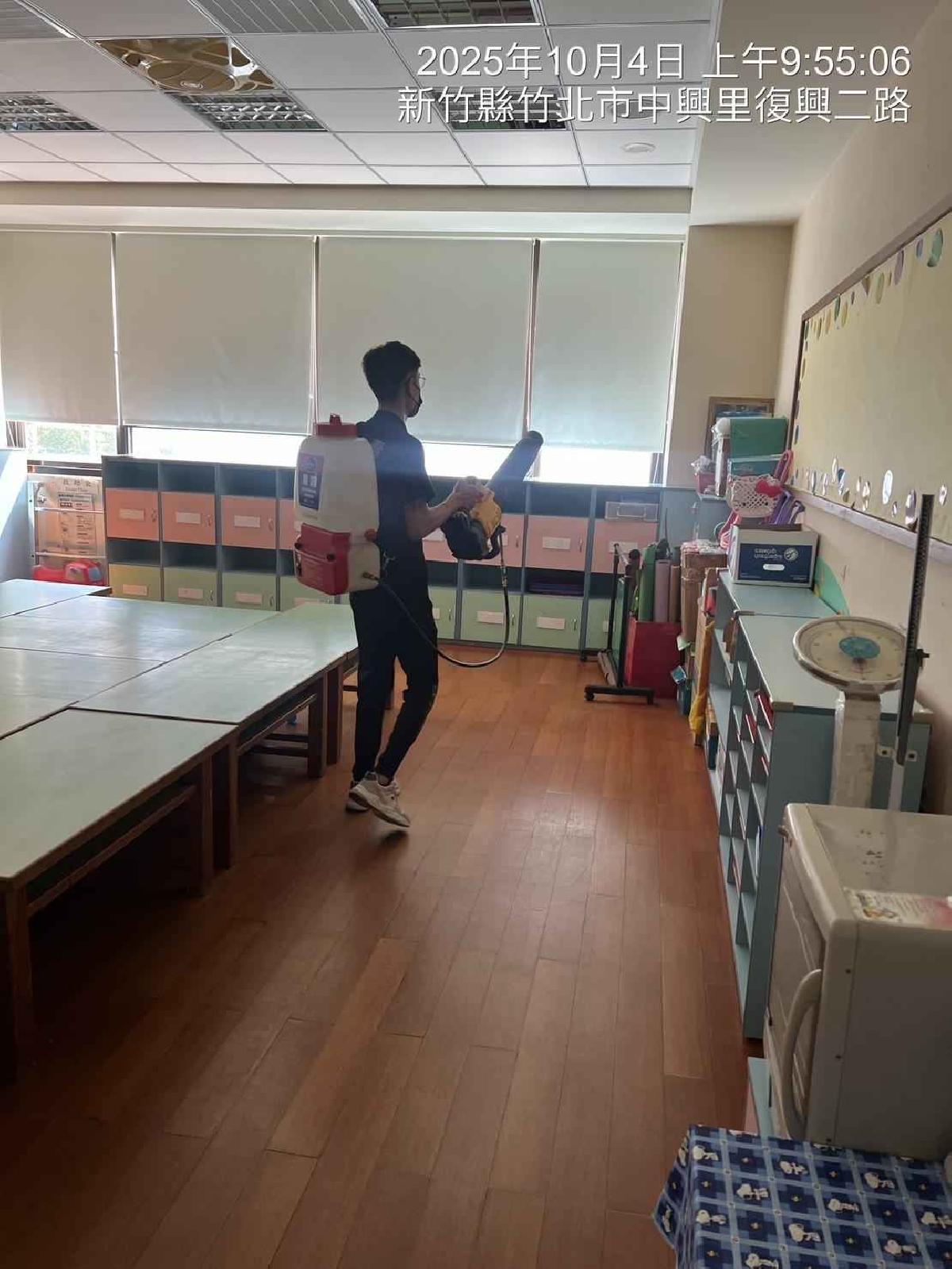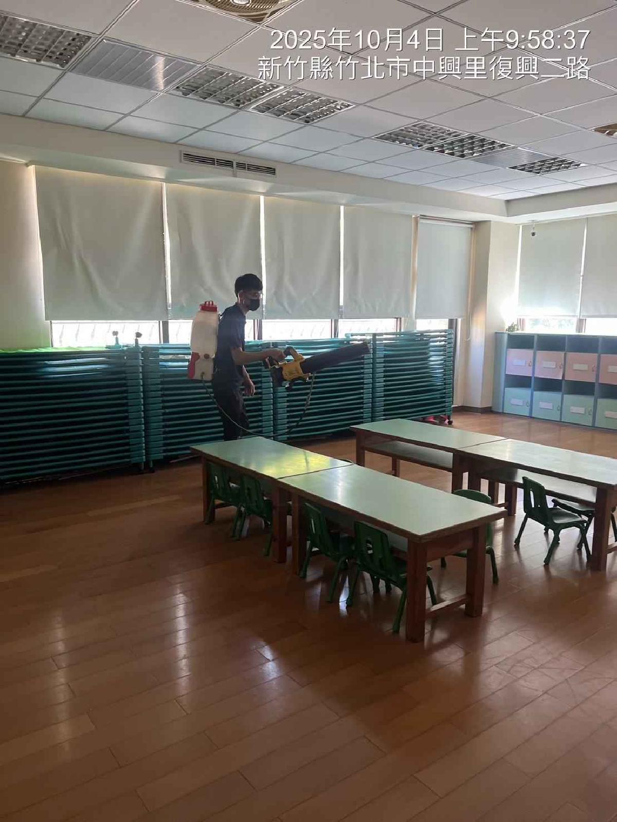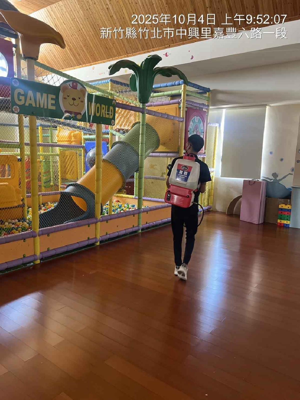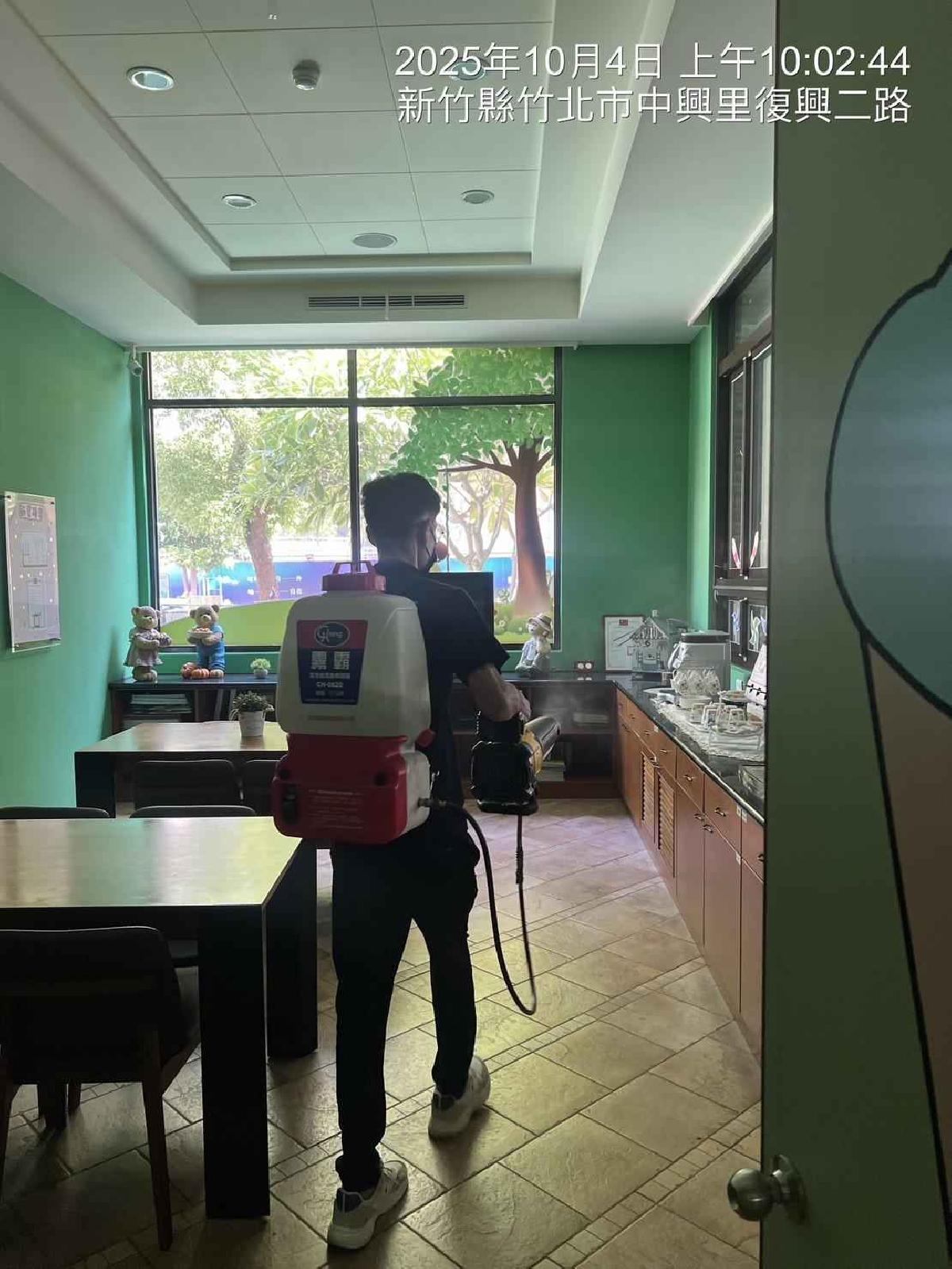 本園利用假日時間,特別聘請專業廠商進行全園環境消毒作業,包含教室、走廊、廁所及遊戲區,確保幼兒返園後有一個安全、乾淨的學習環境。